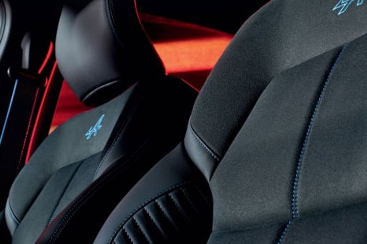 The rear spoiler comes standard, while the front seats feature suede upholstery with blue stitching, symbolizing Alpine.