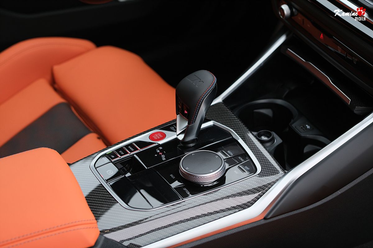 El color naranja de los asientos del M3 es muy atractivo, pero los detalles como el trim de carbono real, el botón de arranque del motor en rojo y la palanca de cambios exclusiva de M son simplemente impresionantes.
