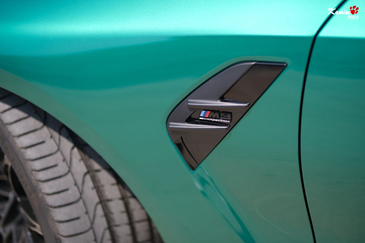 Il colore verde metallico dell'M3 Competizione è davvero accattivante, e il suo posteriore sexy... Preferisco addirittura il retro al design frontale. Le luci posteriori ben definite, il grande doppio scarico che simboleggia l'M e i passaruota generosi!
